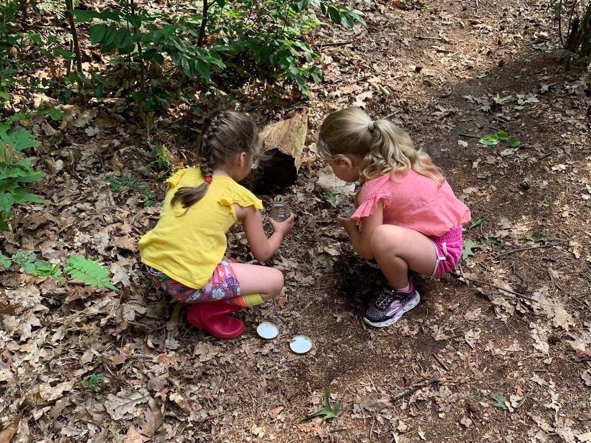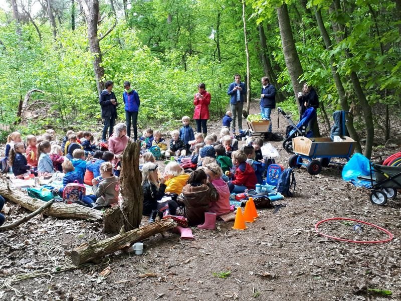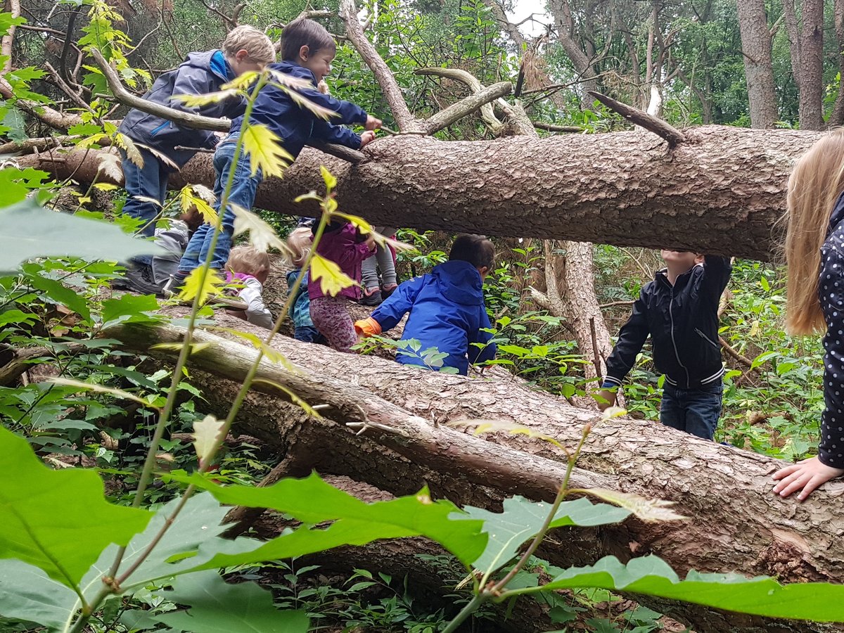Als het weer het toelaat gaan de kleuters een ochtend in de week naar het vlakbij gelegen bos. Daar komen alle leerdoelen aan bod: ontdekken, onderzoeken, ervaren. Wat zit er in de grond? Hoe gaan we deze zware tak optillen? Wat zien we daar in de struiken?